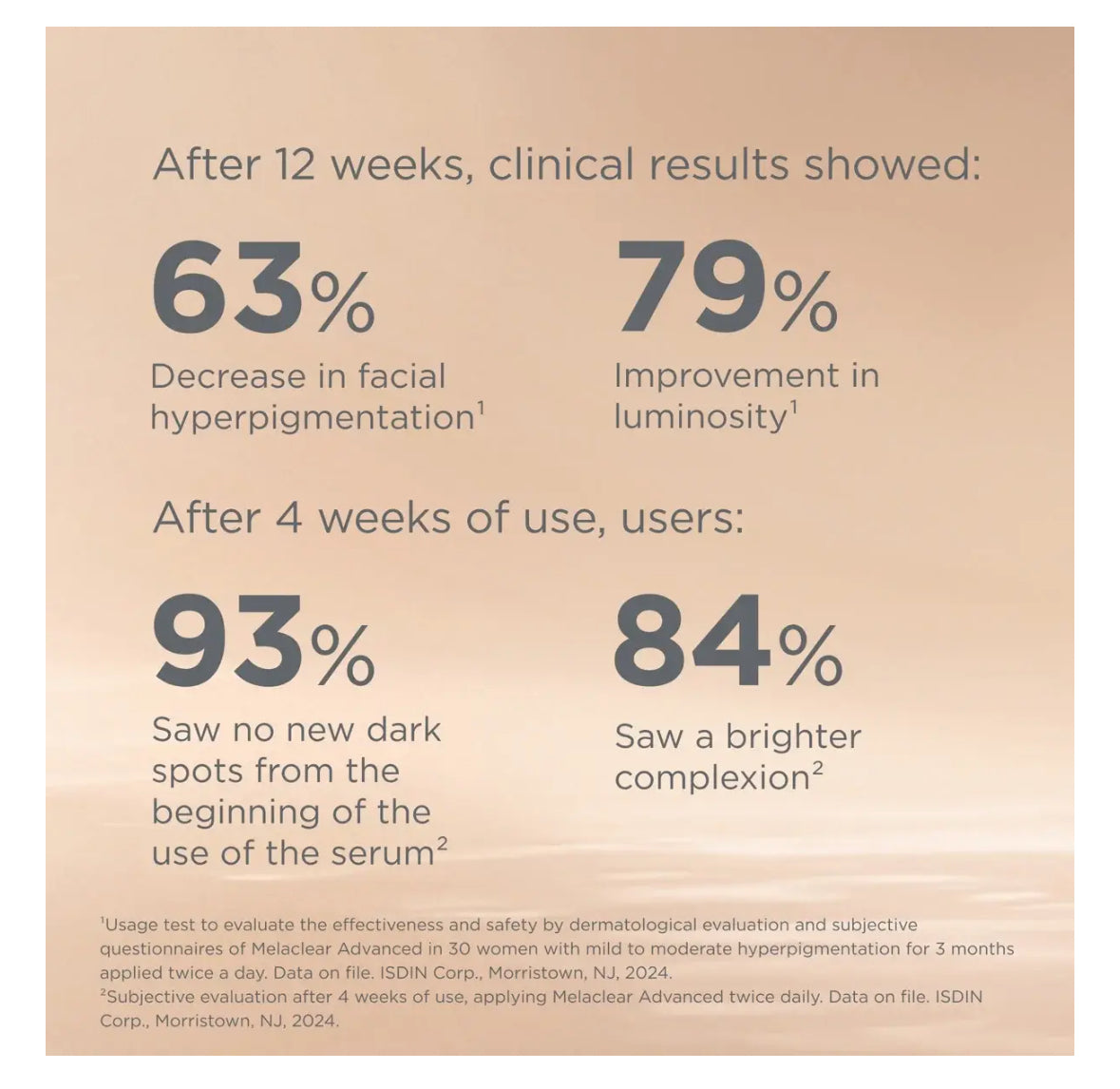Fade and forget discoloration with Melaclear Advanced pigment-correcting serum. Daily use reduces dark spots with notable results as early as two weeks and remarkable results within 12 weeks. Achieve lasting radiance with this powerful blend of complexion-unifying ingredients, including tranexamic acid, niacinamide, and Spot Corrector Complex.